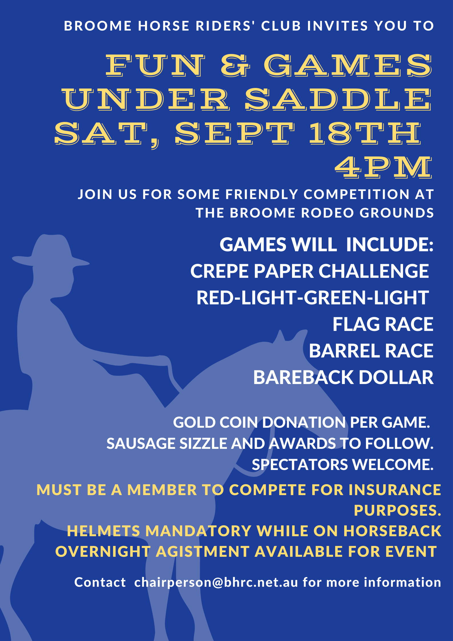 May 15, 2021; 4-6pm: Broome Horse Riders’ Club Fun Day