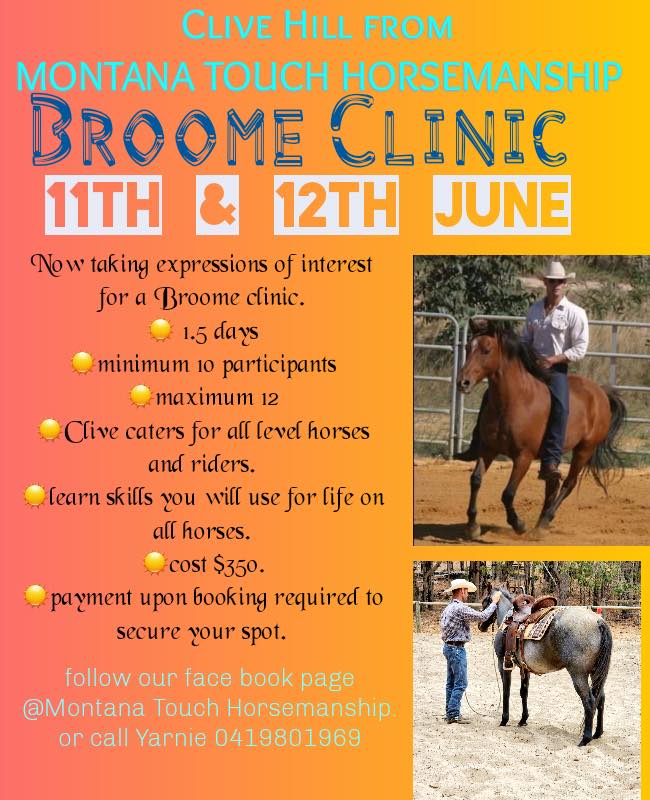 11 – 12 June 2022 Clive Hill – Montana Touch Horsemanship – $350 1.5 day horsemanship clinic. Contact Yarnie for more information 0419 801 969