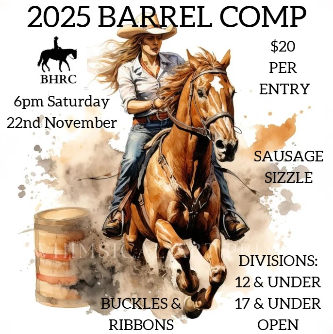 22nd November 2025 – Annual Barrel Comp – See 2025 Barrel Comp – Sausage sizzle and drinks on sale. All proceeds to BHRC.